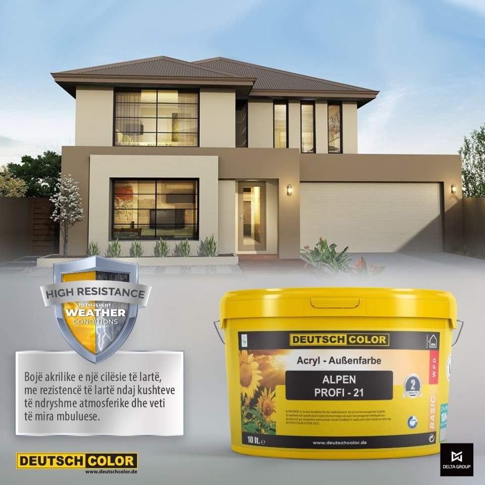 Bojë akrilike e një cilësie të lartë, me rezistencë të lartë ndaj kushteve të ndryshme atmosferike dhe veti të mira mbuluese